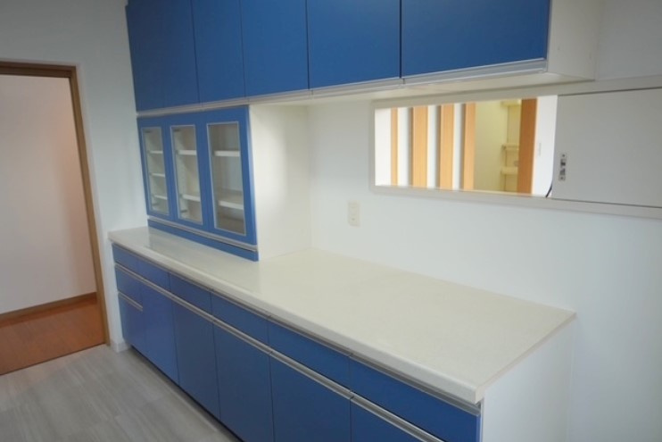 鮮やかなブルーのシステムキッチンが映えるシンプルな白いクロスを採用しました。