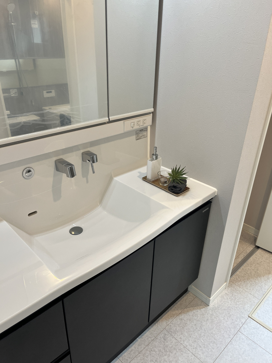 キッチンと同色の洗面化粧台を設置