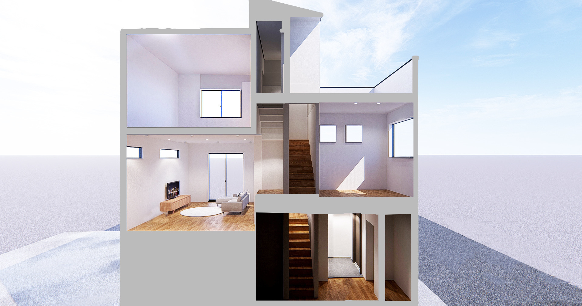 今回の新築分譲住宅 Refinde seriesは高台の立地を最大限に活用したスキップフロアーを採用した建物を建築